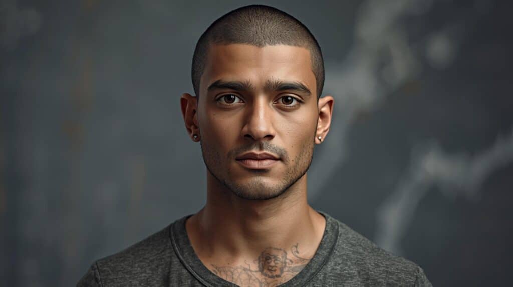 Le buzz cut est peut-être la version classique de la coupe homme rasée. Il s’agit d’une coupe militaire où les cheveux sont coupés très courts et uniformément sur l’ensemble du crâne. Simple, tendance et facile d’entretien il s’inscrit dans un style capillaire minimaliste, polyvalent et élégant.
